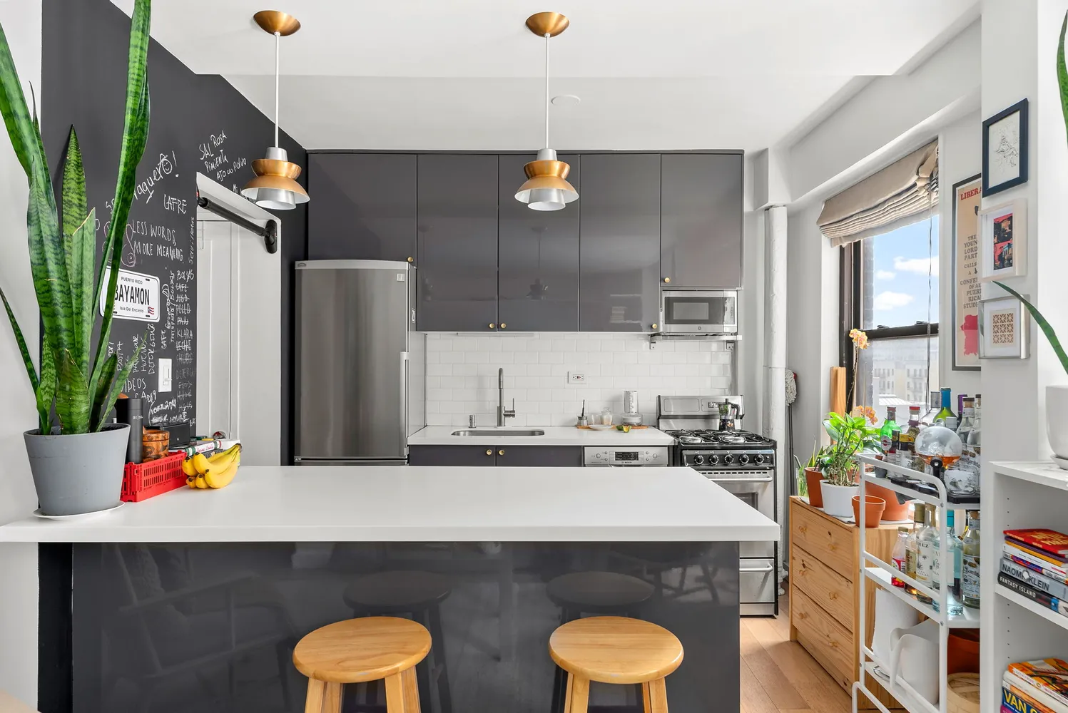 This thoughtfully designed home stands out with its excellent light, efficient layout and impressive storage throughout. The renovated kitchen features stainless steel appliances including a dishwasher and microwave, paired with sleek cabinetry and a spacious island that doubles as a breakfast bar with bonus storage. The living area is anchored by two oversized closets, built-in shelving, and a cleverly designed nook that functions perfectly as a sleeping area or home office. The windowed bathroom is styled with timeless subway and penny tile, and two expansive west-facing windows flood the space with natural light.
