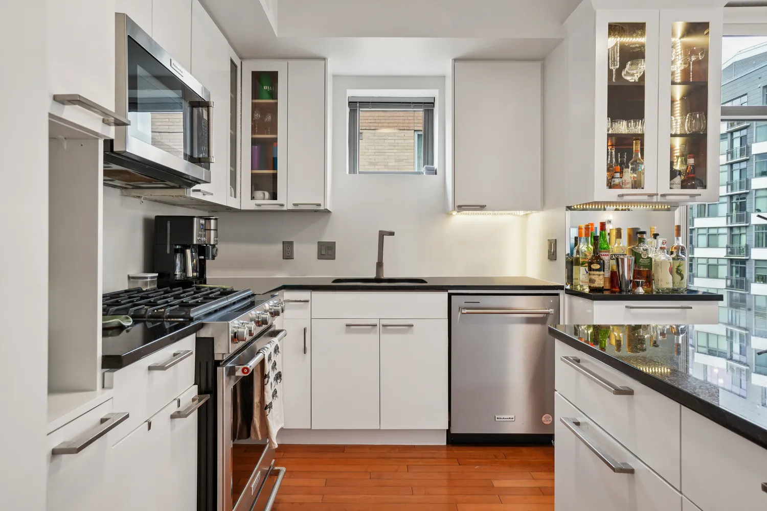 Features include an upgraded gourmet kitchen with stainless steel appliances and in-unit w/d. The primary bedroom has an en-suite bathroom with double sinks. The guest bedroom is currently being used as an office but fits a queen size bed. The den is also being used as an office. Also...Beautiful, modern corner unit with 2 bedrooms + den and two full bathrooms with garage parking! The condo is 1,340 sf, has floor to ceiling windows with amazing natural light, an open floor plan and hardwood floors.
